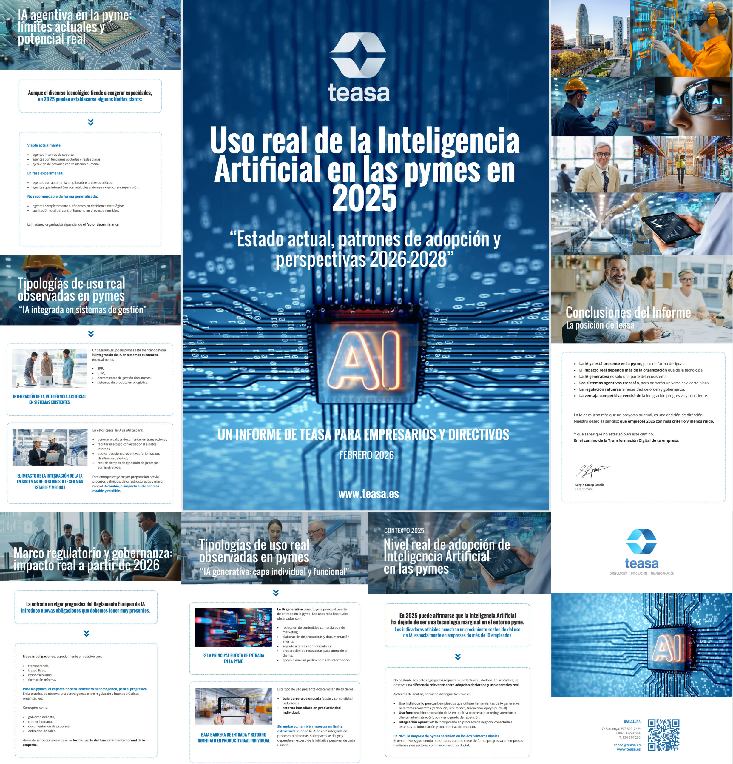 En aquest informe podreu trobar una explicació clara, sintètica i amb dades actualitzades, del nivell real d’adopció actual d’Intel·ligència Artificial a les pimes, les diferents tipologies d’ús real de la IA observades fins ara, especialment la IA generativa i la IA agentiva, quins factors crítics seran decisius per a l’èxit o fracàs de projectes de IA en els propers mesos, l’impacte real del “nou Marc regulador i governança” que s’haurà de tenir molt present aquest any que acaba de donar inici, així com les principals conclusions que des de teasa hem pensat que seran importants sobre l’impacte de la Intel·ligència Artificial a les pimes aquest any 2026.